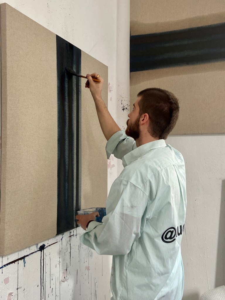 Les toiles s’opposent, s’unissent, des retours en arrière, des sauts en avant, un aller retour constant au sein même de sa pratique picturale qu’il vie au jour le jour dans son atelier.